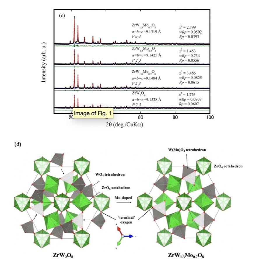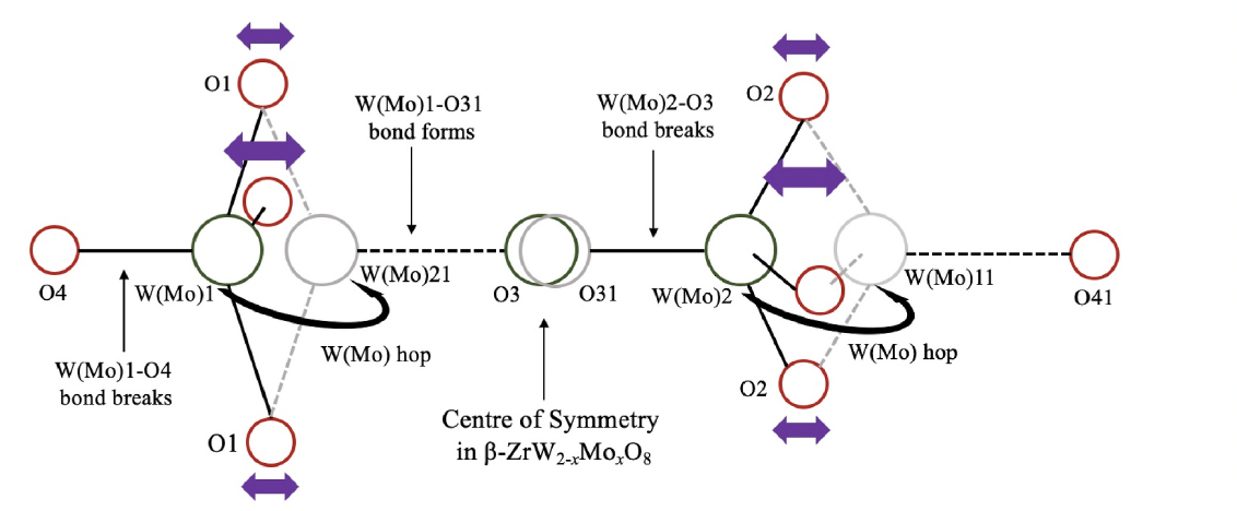 该研究采用液相法和放电等离子体烧结法制备了ZrW2-xMoxO8 (0 ≦x≦ 1)陶瓷材料。这种固溶体陶瓷材料被证实在宽温度区间内各向同性热膨胀系数呈现出从负值到近零热膨胀系数的系统性渐进过程。该研究还利用原位 X 射线衍射和原位拉曼光谱研究了ZrW2-xMoxO8的晶体结构,阐明了Mo的掺杂量对热膨胀系数的变化规律和有序-无序相变的机理。该研究通过精修晶体的晶格常数以及各个原子之间的键长键角等晶体常数确定了桥氧原子的横向运动是导致该固溶体材料的负膨胀特性的机制,并且Mo的掺杂量的增加会导致桥氧原子的横向运动的振幅减弱从而导致负膨胀特性的减弱,同时确定了末端氧原子的迁移运动是导致该固溶体材料的相转变发生的机制并且Mo的掺杂量的增加会导致末端氧原子和金属原子(W(Mo))之间的键更加容易断裂从而导致相转变的发生温度的降低。该份工作为控制热膨胀系数提供了理论支持,并有助于推动复合材料在热膨胀控制上的发展。