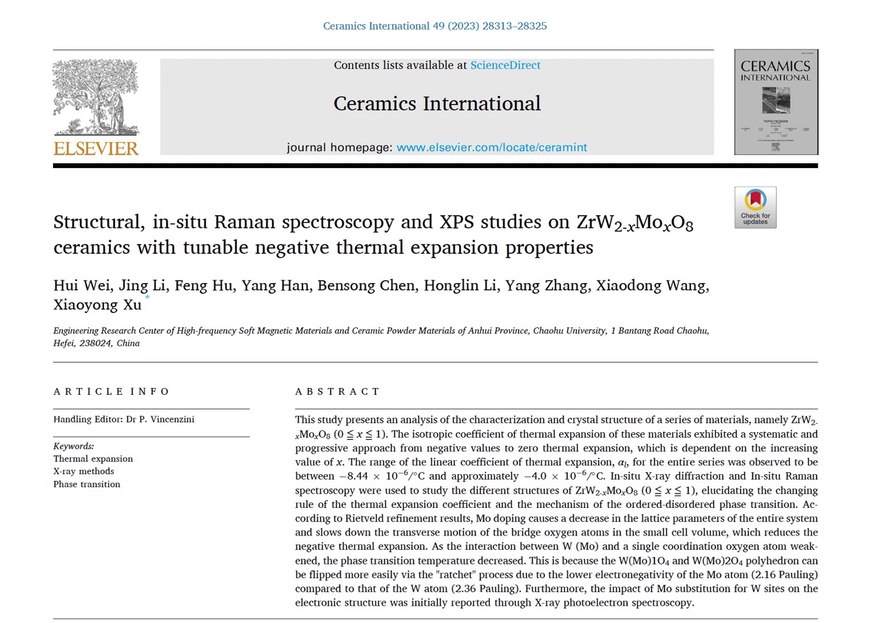 近日,我院功能陶瓷粉体材料与器件科研创新团队魏徽博士为第一作者,巢湖学院为通讯单位,在材料领域国际权威期刊《Ceramics International》(中科院一区, IF:5.2)发表关于钨酸锆负热膨胀陶瓷材料的最新研究成果“Structural, in-situ Raman spectroscopy and XPS studies on ZrW2-xMoxO8 ceramics with tunable negative thermal expansion properties”。