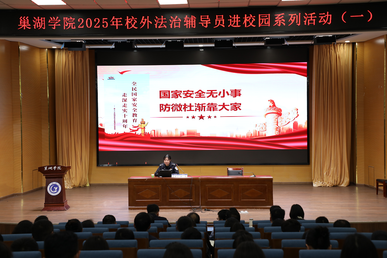 学校聘请公安民警担任学校法治辅导员,联合巢湖市公安局举办国家安全法治教育讲座。法治辅导员通过“以案说法、以例示警”讲解专业知识,为增强大学生国家安全教育提供精准化、系统化的安全教育指导。