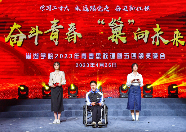 五四精神传薪火,激扬奋斗献青春。主题晚会以五四表彰为契机,将大学生思想引领融入校园美育,以舞台艺术的形式为巢院师生带来一场别开生面的青春思政课,达到了以鲜明的旗帜引领青年,以榜样的力量激励青年,以艺术的魅力感召青年的活动目的。在新时代新征程上,巢院青年师生必将深入学习宣传贯彻党的二十大精神,以习近平新时代中国特色社会主义思想为指引,坚定理想信念,砥砺奋斗前行,以实际行动奔赴青春之约。