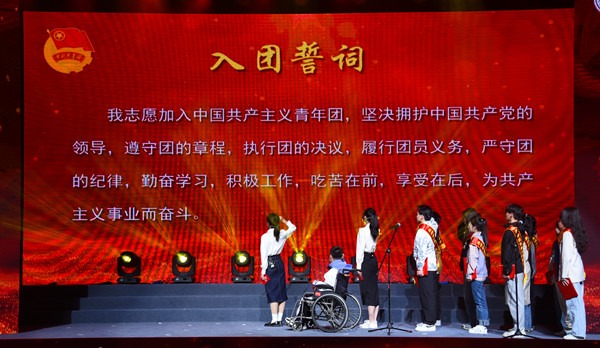 主题晚会的每个篇章开启前还穿插进行团干代表、团员青年代表分享环节。工商管理学院团委书记许沙、校团委社团管理部部长郭华分享了作为一名新团干的满满收获以及与青年学生一起工作的感触,分享了被青年学生投入忘我工作、履职尽责、担当有为、无私奉献的奋发姿态所激励、所感动的一幕幕场景。中国大学生自强之星李贤、安徽省优秀共青团员王引迪、“十佳百优大学生”蒯乐与优秀团员、团干代表一起重温入团誓词,并分享了各自的学习成长经历,感恩学校为自己成长成才提供的宝贵平台,激励朋辈奋发自强,服务社会,报效祖国,绽放青春。参加活动的青年大学生纷纷将自己对未来的期许写进“理想卡”,运动场围栏上挂满了同学们的理想追求寄语,形成了一道理想展示墙、青春宣言墙。