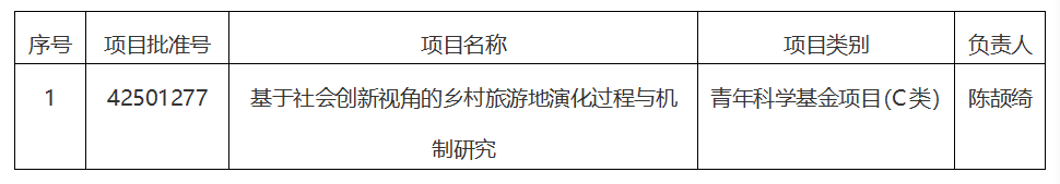 近日,国家自然科学基金委员会公布2025年国家自然科学基金项目评审结果,巢湖学院旅游管理学院陈颉琦博士以“基于社会创新视角的乡村旅游地演化过程与机制研究”(项目编号:42501277)获批立项。