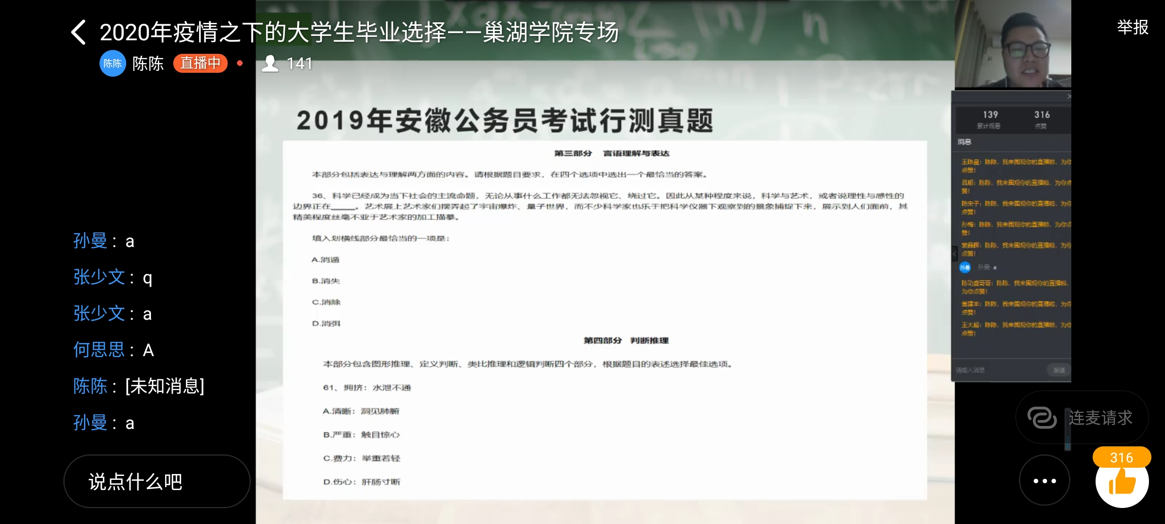 高校毕业生是国家的未来,是建设祖国的支柱力量,2020年毕业生人数再创新高,受疫情影响,就业形势更加严峻。陈老师就此情况从就业政策、考公和考研三方面展开分析,为毕业生解疑答惑。他首先向同学们推荐了诸如人事网的一些招聘网站,指出大家可以通过相关网站搜寻自己感兴趣或擅长的岗位并投送简历。然后,陈老师介绍了公务员考试中行政能力测试题的解题技巧,涵盖数学分析、推理判断、常识判断等多方面内容,针对公务员申论写作的要求、技巧以及注意事项也作了详细地讲解。他还以公务员考试真题为例,结合材料和问题,进行答题指导,就如何做出理论判断,如何结合材料多角度分析问题,如何运用材料内容做好题、得高分等技巧做了具体示范,为同学们提供很大的帮助。最后,陈老师简单地对本年度考研国家线进行分析,为准备考研的同学提供相关建议,为即将进行研究生复试的同学讲解注意事项和实用技巧并祝愿他们在考试中取得满意成绩。