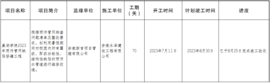 2023年巢湖学院雨污管网缺陷修缮工程进度通报