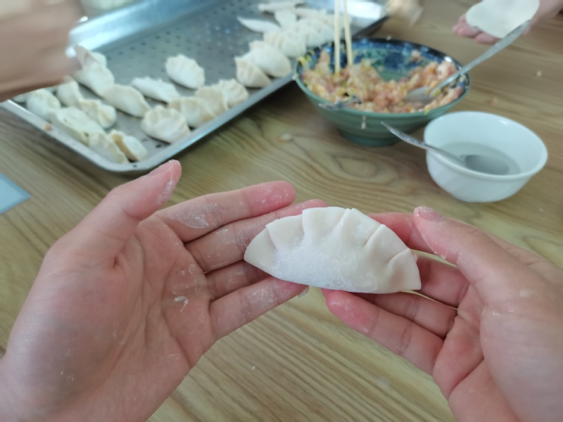活动中,同学们分工协作,洗菜、切菜、拌饺子馅,饺子馅准备完毕,同学们开始包饺子,因同学们来自省内外各地,各地的包饺子方式不同,因此包的饺子形状也各不相同,各不相同的饺子放在一起,象征着五湖四海的学子们聚集在巢湖学院机械工程学院这个大家庭中,其乐融融。为了活跃气氛,大家约定举办一场包饺子大赛。很多同学是第一次包饺子,对包饺子技艺并不熟练,向身边的同学学习包饺子,有的甚至直接视频亲朋好友在线教学。21机自1班桑庆阳说:“我是第一次包饺子,怎么包都捏不好,不是馅放多了就是放少了,即便是捏上了样子也不好看,但是还是觉得很有成就感。”21材控顾旭说:“别以为我们男生手笨,我包的饺子比女生的还要好看。”他一边说一边高兴地把两个饺子放在一起对比着。