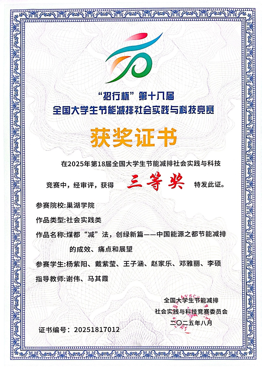 近期,由教育部高等学校能源动力类专业教学指导委员会指导,全国大学生节能减排社会实践与科技竞赛委员会主办的“招行杯”第十八届全国大学生节能减排社会实践与科技竞赛(A类赛事)落下帷幕。巢湖学院旅游管理学院团队(参赛学生:杨紫阳、戴紫莹、王子涵、赵家乐、邓雅丽、李硕,指导教师:谢伟、马其霞)以作品《煤都“减”法,创绿新篇——中国能源之都节能减排的成效、痛点和展望》参赛,经过校赛、函评、会评脱颖而出,最终荣获国家级三等奖。