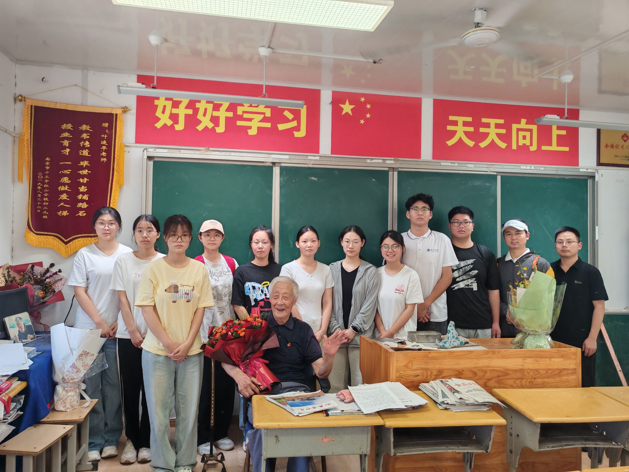 为聆听教育前辈的赤诚心声,汲取坚守教育的精神力量,实践团成员怀着崇敬与期待的心情,来到叶连平老师住处。叶连平老师已有97岁高龄,但仍精神矍铄,热情地接待了实践团成员。