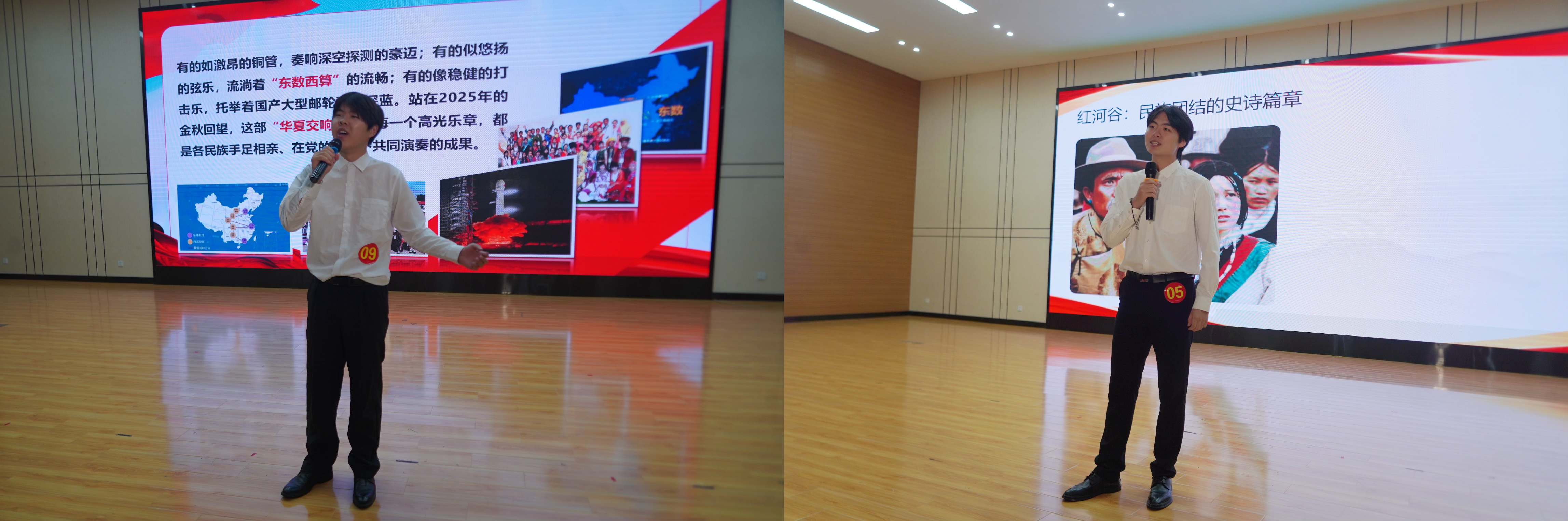 决赛现场,我校黄佳佳同学以《同谱华夏交响乐 共筑团结新篇章》为题,结合自己所学专业,把国家的发展比作一部恢弘的交响乐,56个民族是其中不可或缺的声部,每个人都是新时代“交响乐”的演奏者。他认为,铸牢中华民族共同体意识,不是遥远的口号,而是每个人演奏好每一个音符的责任——既要守护好自己民族的独特音色,也要学会与其他“声部”和谐共鸣。肖炳祥同学则以一部历史电影《红河谷》为切入点,结合巢湖以展演融多俗、景区传认同、社区创示范,绘就民族团结盛景的鲜活事例,阐述了民族团结不仅是中华民族千百年来的精神财富,更是国家繁荣昌盛的稳固基石,各民族要像石榴籽一样紧紧相依。经过激烈角逐,最终,我校黄佳佳、肖炳祥2位同学分别荣获特等奖(全场唯一)、二等奖的好成绩,充分展现了我校学子优良的综合素养和昂扬的精神风貌,更体现了新时代青年深厚的家国情怀,赢得了评委与观众的广泛共鸣和认可。