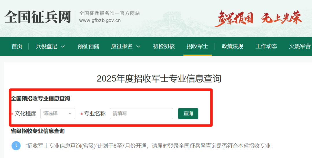 注意“招收军士专业信息查询(省级)”计划于6至7月份开通,请届时登录全国征兵网查询是否符合本省招收专业