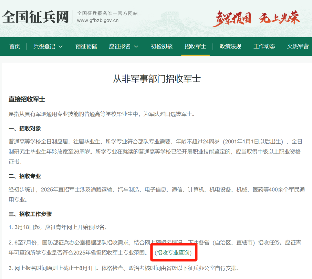 登录“全国征兵网”→点击“招收军士报名”→招收工作步骤之“招收专业查询