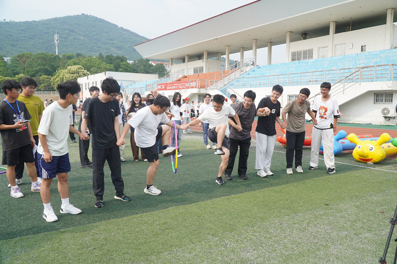 随着一声哨响,比赛正式拉开帷幕。“疯狂毛毛虫”项目中,队员们跨坐在充气道具上,齐声喊着口号,步伐一致地向前冲刺,宛如一条条灵动的彩龙在赛场上飞驰;“珠行万里”考验着团队的默契与协作,选手们手持U型槽,小心翼翼地传递小球,全神贯注的神情与紧密配合的动作令人赞叹;“一圈到底”环节,队员们手拉手,灵活地扭动身躯,让呼啦圈在团队中快速传递,现场加油声此起彼伏;“同心击鼓”最具挑战性,众人合力牵拉鼓绳,通过调整力度与节奏,让鼓面精准接住不断落下的排球,每一次成功击球都引发阵阵欢呼。赛场上,各学院代表队默契配合、奋勇争先,将智慧与力量完美融合;赛场边,观众热情高涨,呐喊助威声、欢笑声交织成一片欢乐的海洋。比赛结束后,工作人员迅速投入到场地清理工作中,他们分工明确、高效协作,很快让操场恢复整洁有序。