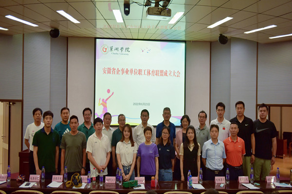 为深入贯彻落实《中华人民共和国体育法》《全民健身计划纲要》《全民健身条例》,进一步推动企事业单位职工体育活动的开展, 6月23日上午,安徽省企事业单位职工体育联盟成立大会在巢湖学院致知楼报告厅召开。中国科学技术大学党委常委、副校长周丛照,巢湖学院党委副书记阮爱民,中国科学技术大学工会常务副主席杨定武,安徽师范大学工会主席余大芹,安徽理工大学工会主席娄志勇,巢湖学院体育学院院长、安徽排球学院院长姚磊出席会议。合肥工业大学、皖维集团、宣城市国税局、铜陵一中等18家企事业单位的相关负责人参加会议。成立大会由巢湖学院工会主席张道才主持。