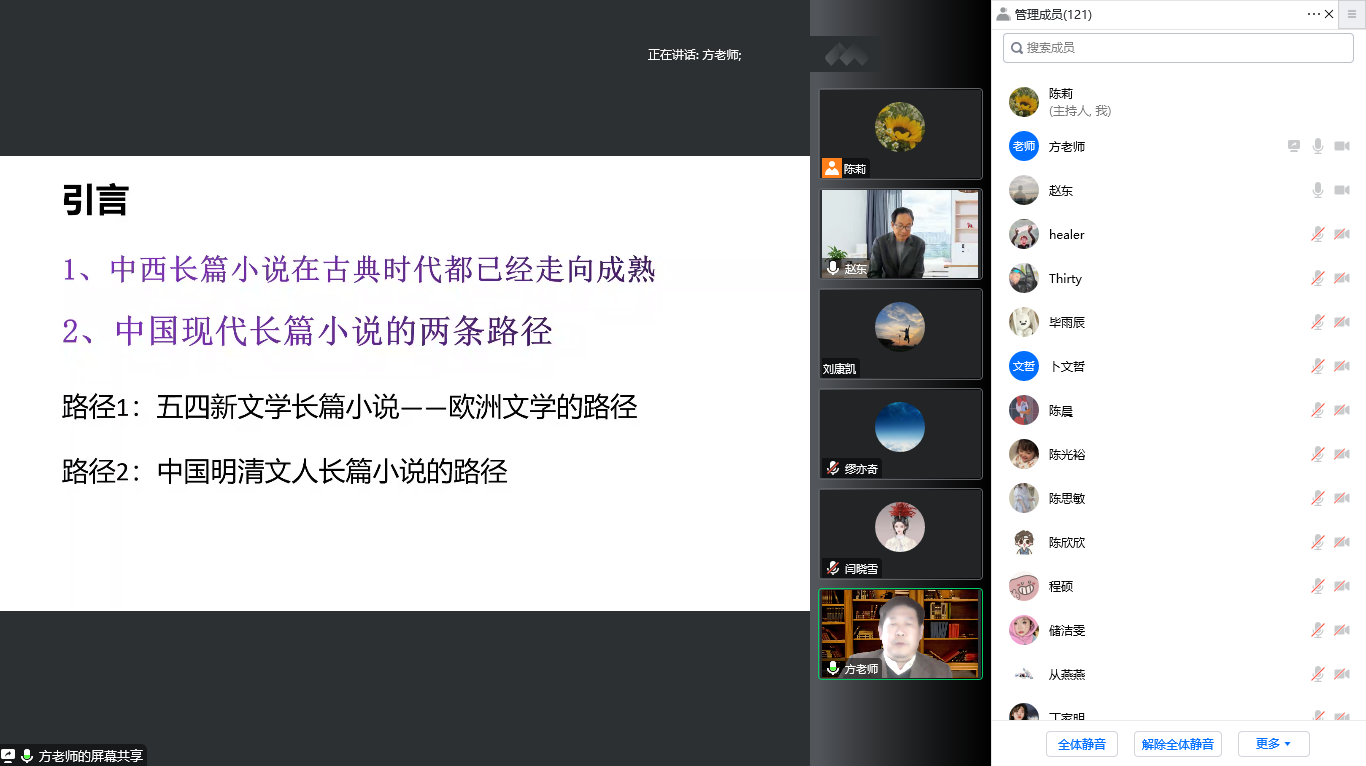 方维保教授在讲座里提出,中国现代长篇小说文体有两条发展路径,一是五四新文学长篇小说的欧洲文学路径,二是中国明清文人长篇小说的发展路径。方维保教授以大量的小说文本阐释为例,完整梳理了中国现代长篇小说及其文体发展史,具体包括:五四时代的现代长篇小说文体探索、1930年代长篇小说文体成熟到新文体期待和1940年代长篇小说文体的新变。