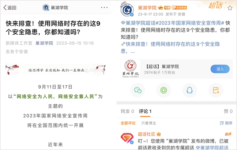 为深入学习宣传贯彻党的二十大精神和习近平总书记关于教育强国、网络强国的重要思想,宣传贯彻习近平总书记对做好互联网时代的学校思想政治工作和意识形态工作、网络安全工作“四个坚持”的重要指示精神,2023年国家网络安全宣传周于9月11日至17日在全国范围内开展。巢湖学院紧密围绕“网络安全为人民,网络安全靠人民”主题,开展了形式多样、内容丰富的网络安全宣传活动。