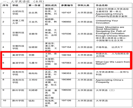近日,安徽省外国语言文学学会公布了安徽省(本科)外语课程思政活动决赛环节的入围名单。经过第一轮线上筛选,全省本科高校共有16件作品入围安徽省(本科)外语课程思政案例评选活动的第二轮线下评比。学院共有4项课程思政教学案例进入安徽省决赛,入围数量位居第一。其中贺静团队和马曼华团队进入大学英语组决赛,王林艳团队和汪袁圆团队进入英语专业组决赛。