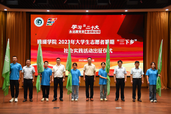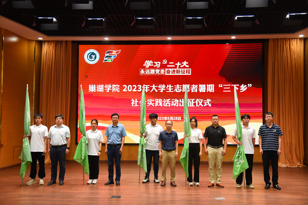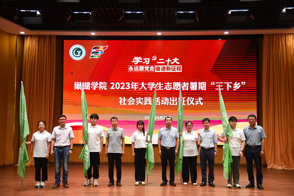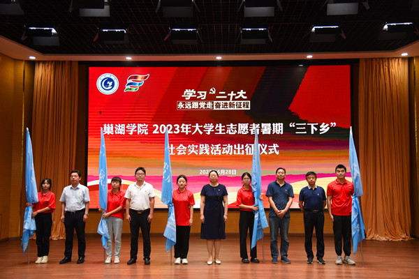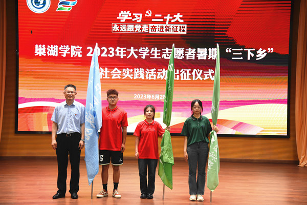 为深入学习宣传贯彻习近平新时代中国特色社会主义思想和党的二十大精神,认真落实团十九大部署,坚持在火热实践中培育有理想、敢担当、能吃苦、肯奋斗的新时代好青年,6月28日下午,巢湖学院2023年大学生志愿者暑期“三下乡”社会实践活动出征仪式在求实楼报告厅举行。校党委书记周峰,党委委员、党委组织部部长柯应根,校办公室、党委宣传部、党委保卫工作部、教务处等相关职能部门负责人和各学院党政领导出席仪式,各学院团委书记、重点团队指导教师和成员代表参加仪式。仪式由校团委书记王倩主持。