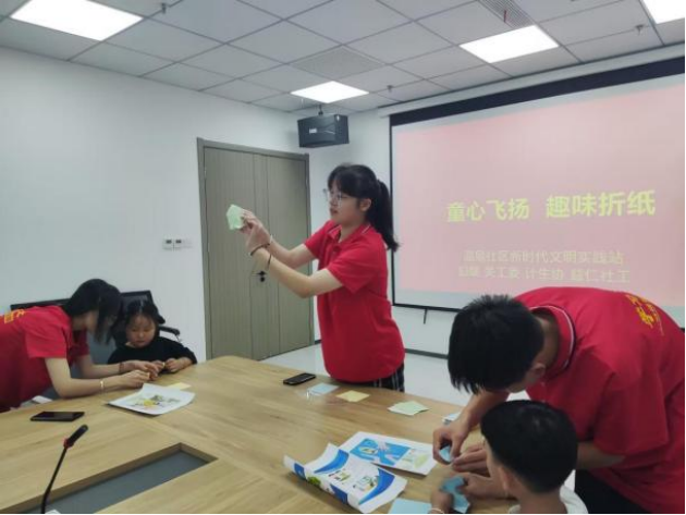 与此同时,为提高活动的多样性和丰富性,实践团志愿者为社区青少年准备手工制作材料,在志愿者的带领下学习制作折叠解压小玩具,并对作品进行评比,锻炼了青少年的动手能力和创造性思维,同时又有利于激发青少年们的团队合作精神,增进同学之间的友谊。