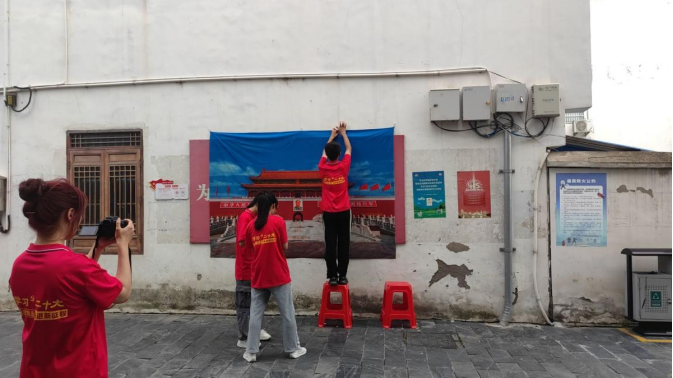 6月29日下午,实践团队在社区搭设北京天安门背景幕布并免费提供拍摄服务,社区内的老人们陆续赶来活动现场,志愿者们组织老人排队等候,耐心指导着老人们拍照的姿势,为老人留下珍贵回忆,圆一场“北京”梦,定格最美夕阳红。居民们说道:“年轻的时候没有这个条件,没留下什么照片,现在年纪大了,附近没有什么照相馆,出去也不太方便,今天能够来这儿拍照,心里高兴得很。”