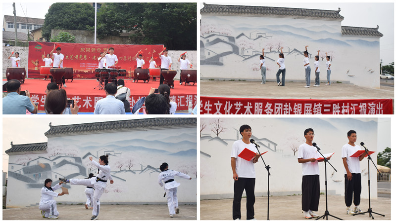 在建党102周年华诞,巢湖学院“一院一镇一品”专项团——大学生文化艺术服务团走进巢湖市栏杆集镇、银屏镇三胜村,围绕“学习二十大 永远跟党走奋进新征程”主题开展体育文艺巡回演出。服务团由来自体育学院和工商管理学院共50名大学生组成,巢湖学院体育学院党委副书记朱春花、服务团指导老师郭世洪和杜锐率队参加活动。