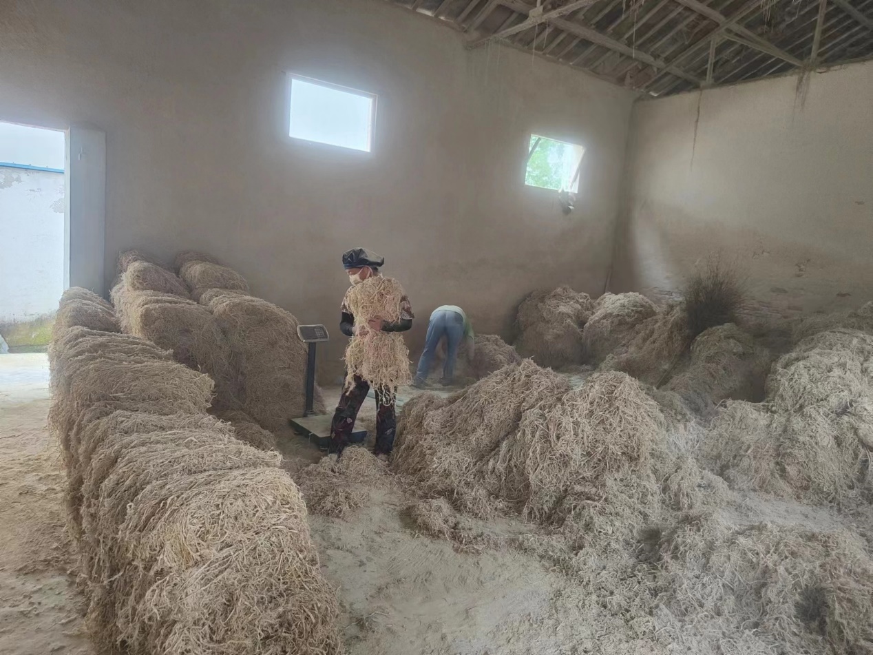随后,志愿者跟随乌溪村村民的指示,走进山下一排平房内,看到工人师傅们正在处理刚从山上运下来的稻草。志愿者们经过询问发现,这里的工人师傅都是来自乌溪村的村民,由于离家近的原因,很多的村民会选择来这里工作。