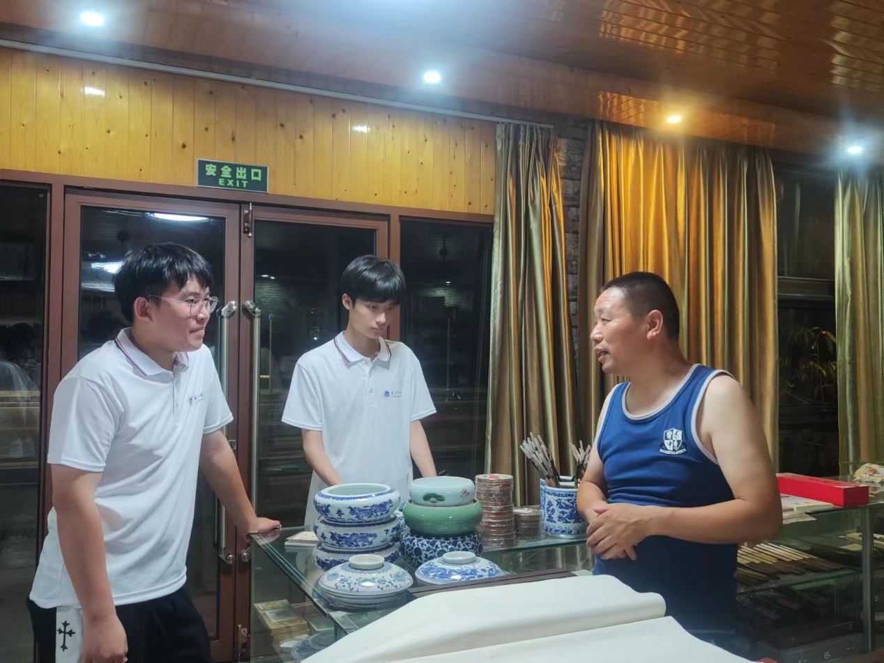 7月2日,志愿者们在周边进行走访调研,有幸采访了当地一位宣纸文化爱好者吴传辉先生。吴光辉先生是土生土长的乌溪村人,志愿者们走进他的家中,发现墙上有各式各样的书画作品,笔墨纸砚摆放的也非常齐全。