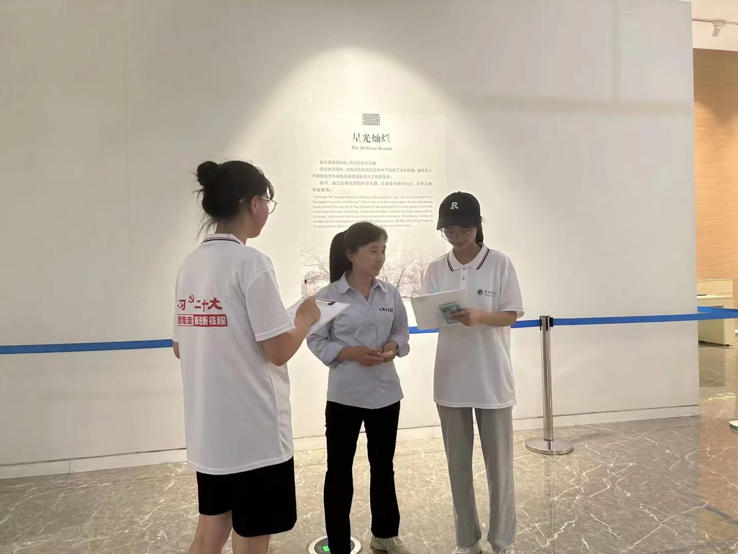 除此之外,园区内工作人员也热情的为志愿者们讲述起宣纸原材料挑选以及加工方式。志愿者们了解到宣纸的制作是由精选的沙田稻草和乔木青檀皮制成。在工作人员的指引下,志愿者们来到了馆藏宣纸与书画精品展示区,各式各样的书法及绘画作品被陈列于此。