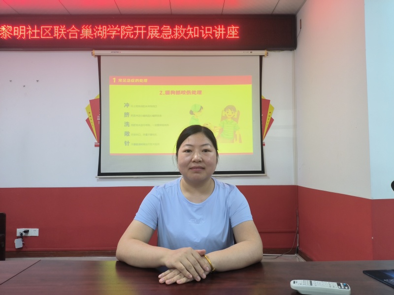 为提高居民面对突发情况和意外事件的处理能力,实践团于7月5日下午在黎明社区开展安全急救知识讲座。本次讲座邀请巢湖学院校医院袁玉老师主讲。活动中,袁玉通过生动简洁的幻灯片对外伤、发热、鼻出血等方面急救知识进行详细讲解,并进行海姆立克法急救法现场演示。在讲解部分结束后,袁玉对社区居民所提出的问题进行一一解答。袁玉老师的讲解内容丰富、专业生动、通俗易懂,居民反响积极,现场氛围热烈。
