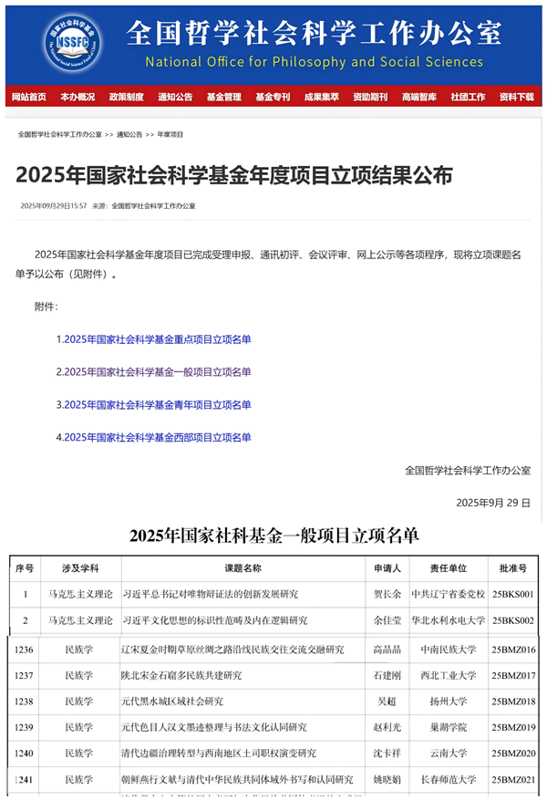近日,经受理申报、通讯初评、会议评审、网上公示等各项程序,全国哲学社会科学工作办公室正式公布了2025年度国家社科基金年度项目立项名单。我院教师赵利光博士申报的《元代色目人汉文墨迹整理与书法文化认同研究》获民族学一般项目。这是我院继4次荣获国家艺术基金项目之后,首次实现国家社科基金项目突破。